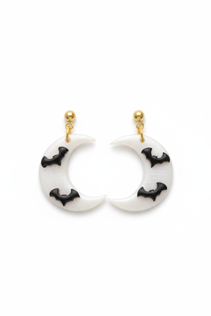 Pearlescent crescent moons with flying bats handmade form polymer clay with 18k gold findings