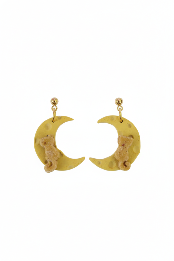 Cheese crescent moons with chicken nugget kitty’s handmade from polymer clay with 18k gold findings